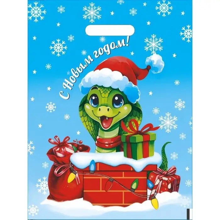 Новогодний полиэтиленовый пакет с вырубной ручкой, украшенный символом года – изящной змеёй, идеально подойдёт для подарков и праздничных покупок.