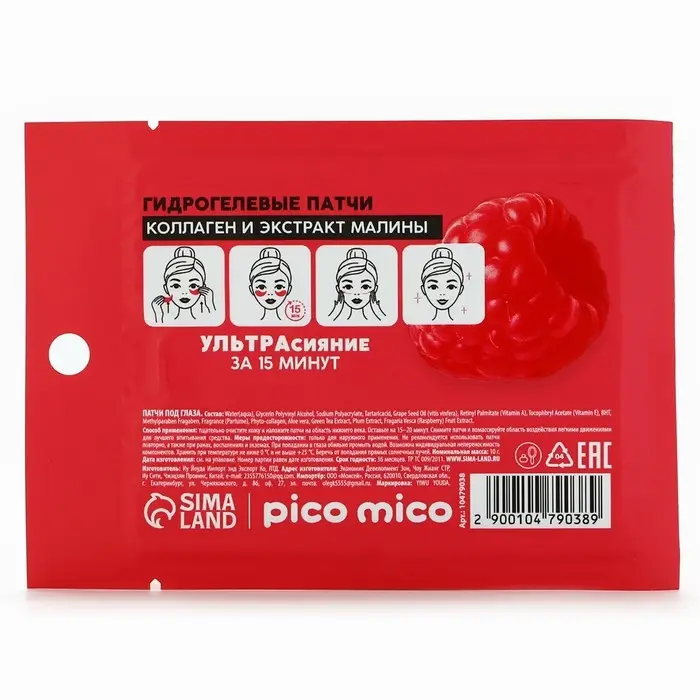 Патчи для области вокруг глаз Sweet raspberry, 1 пара, гидрогелевые с коллагеном и экстрактом малины, PICO MICO