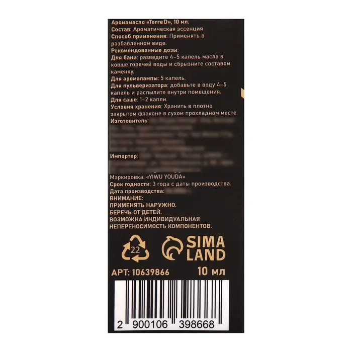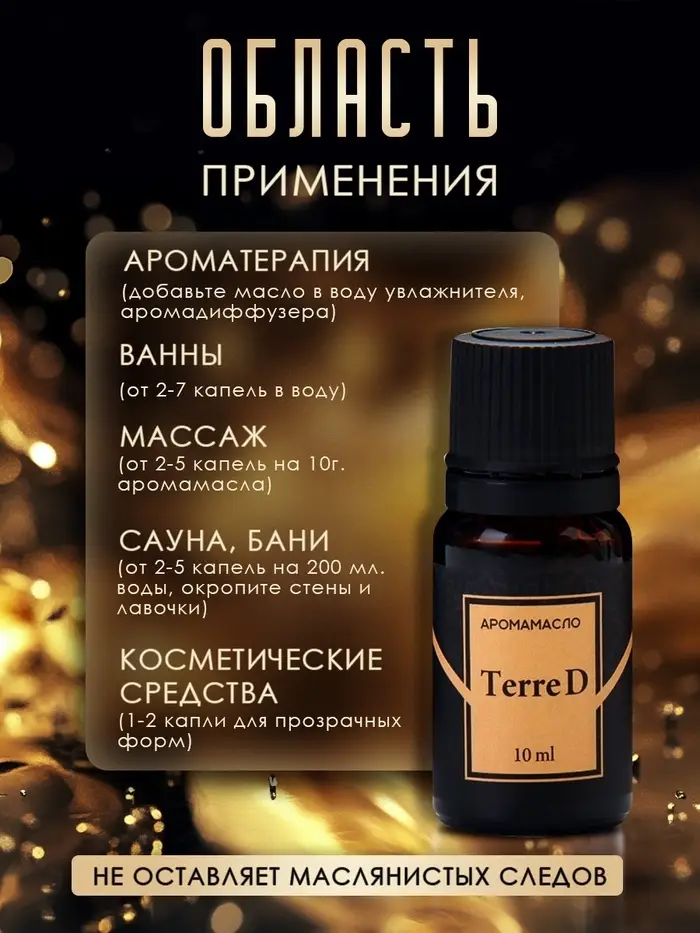 Компактный флакон объемом 10 мл идеально подойдет для использования в течение дня или для путешествий. Аромамасло Terre d станет прекрасным выбором для личного использования или изысканным подарком, который подчеркнет ваш вкус и стиль.
