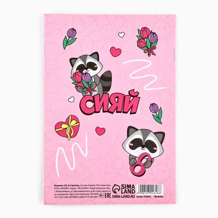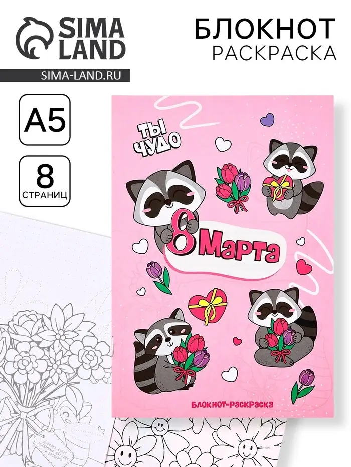 Блокнот раскраска А5, 8 страниц «Енотик. 8 марта»