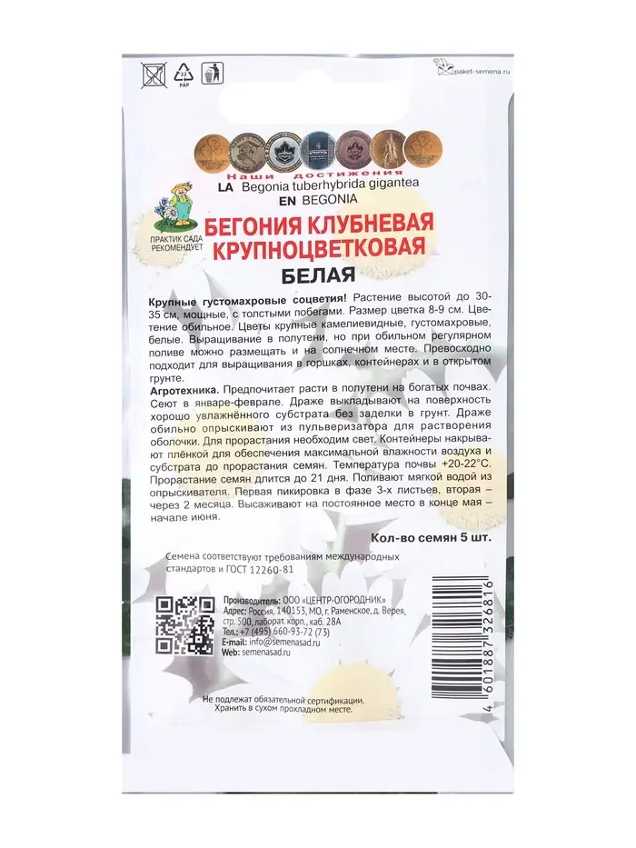 Семена цветов Бегония клубневая крупноцветковая Белая, 5шт