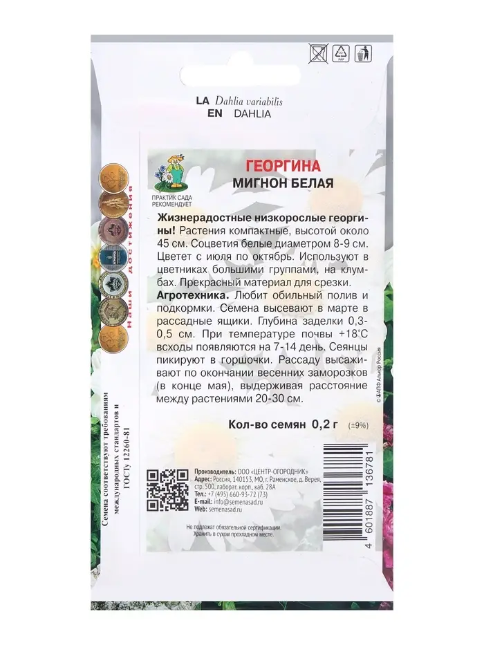 Семена «Георгины белые» идеально подойдут для тех, кто хочет добавить утончённости в сад или украсить балкон живой белой красотой. Эти цветущие среднерослые растения оживят пространство в течение всего летнего сезона, украшая клумбы и цветники своими кустовыми формами.