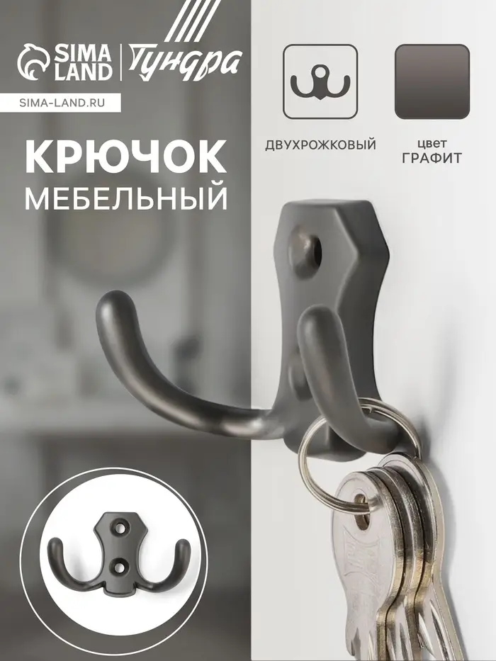 Крючок мебельный ТУНДРА TKd=007, двухрожковый, графит