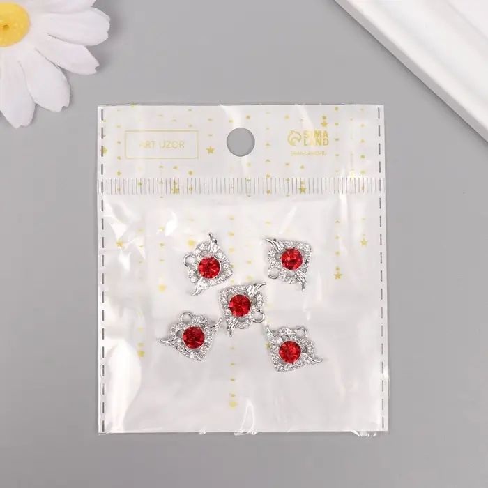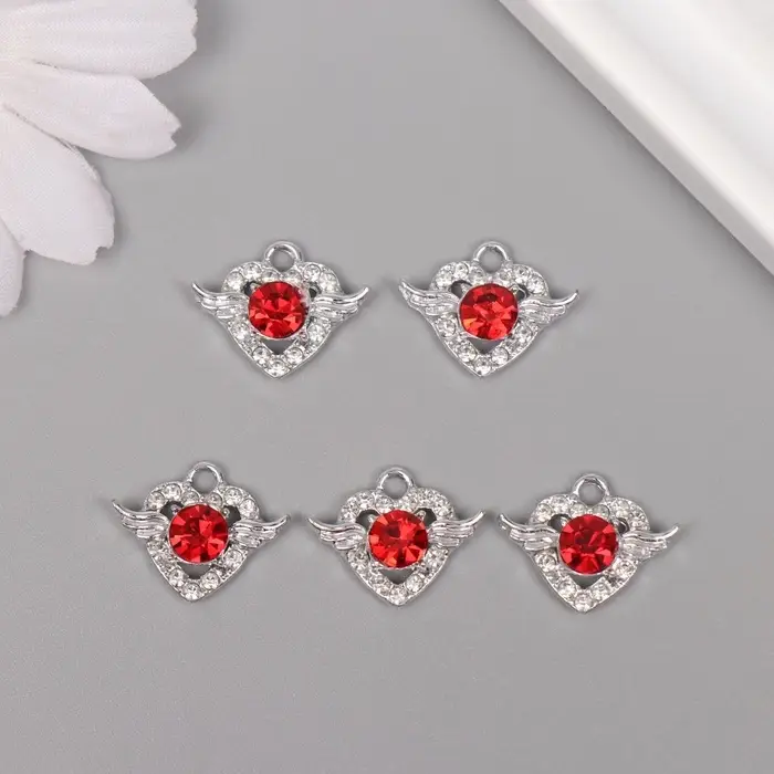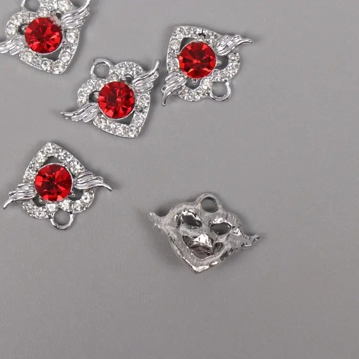 Декор для творчества металл, стразы "Сердце" серебро, красный 1,5х1,8х0,6 см