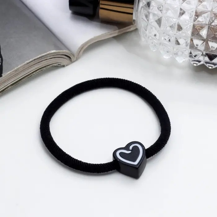 - Элегантный дизайн: черная текстильная резинка украшена привлекательным элементом в форме сердца. Привлекает внимание, удобно фиксируя волосы и подчеркивая индивидуальность.