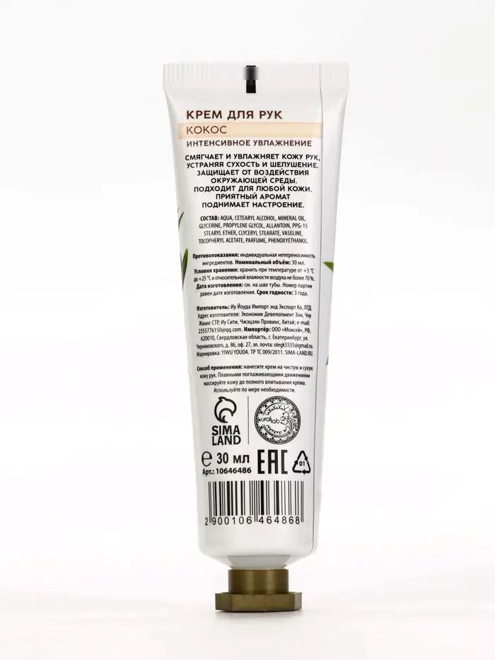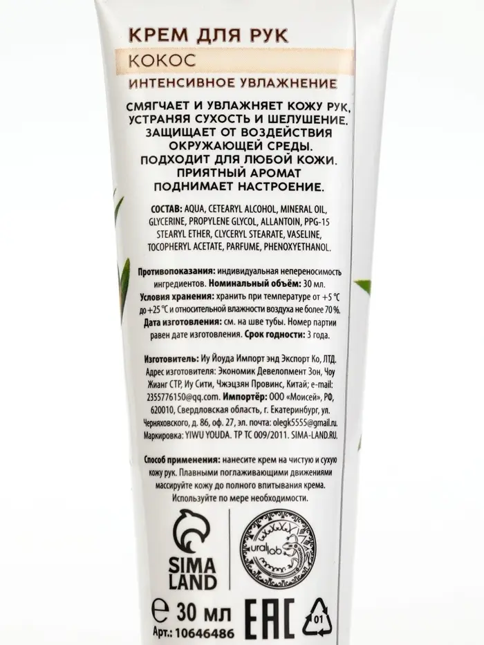 Крем для рук, интенсивное увлажнение, аромат кокоса, 30 мл, URAL LAB