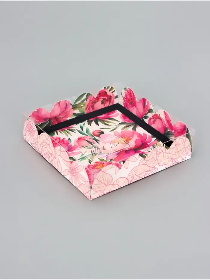 Прочный картон обеспечивает надежную защиту содержимого, а прозрачная крышка позволяет сразу оценить внешний вид угощений без необходимости открывать коробку.