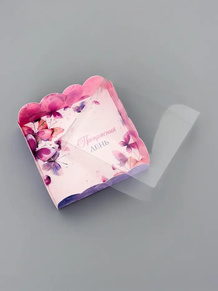 Прочный картон обеспечивает надежную защиту содержимого, а прозрачная крышка позволяет сразу оценить внешний вид угощений без необходимости открывать коробку.