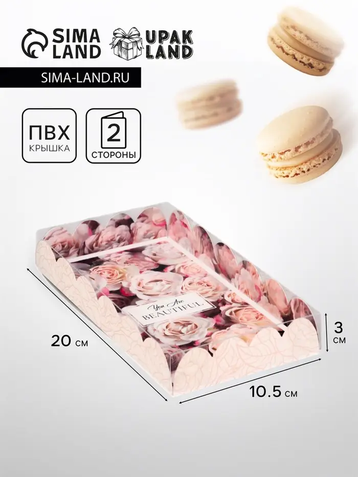 Прочный картон обеспечивает надежную защиту содержимого, а прозрачная крышка позволяет сразу оценить внешний вид угощений без необходимости открывать коробку.