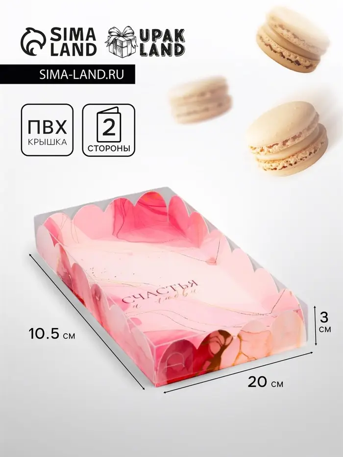 Прочный картон обеспечивает надежную защиту содержимого, а прозрачная крышка позволяет сразу оценить внешний вид угощений без необходимости открывать коробку.