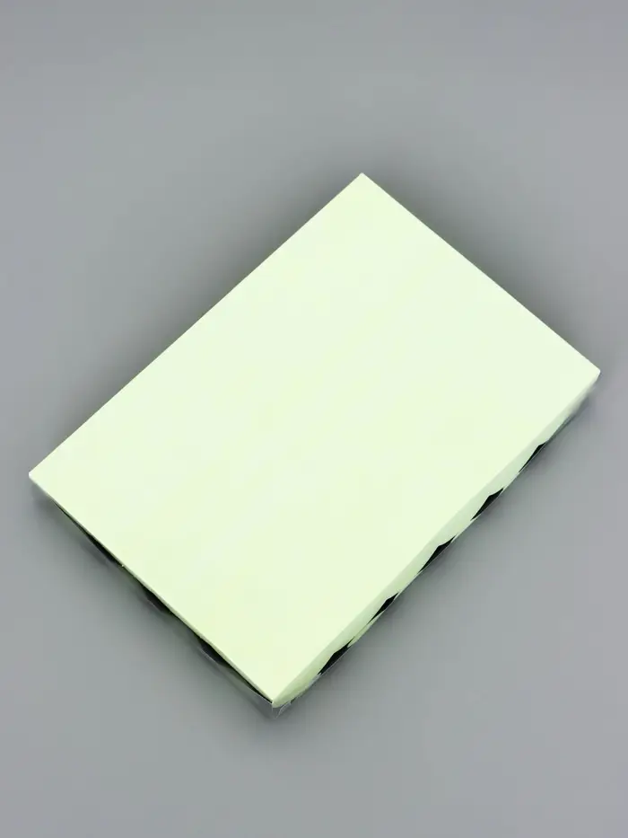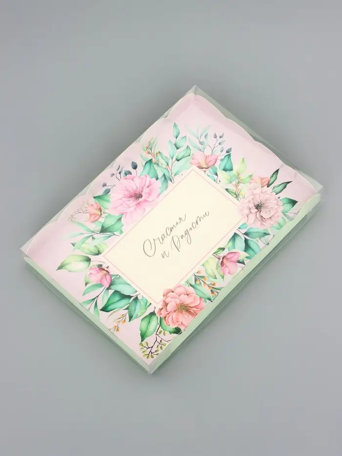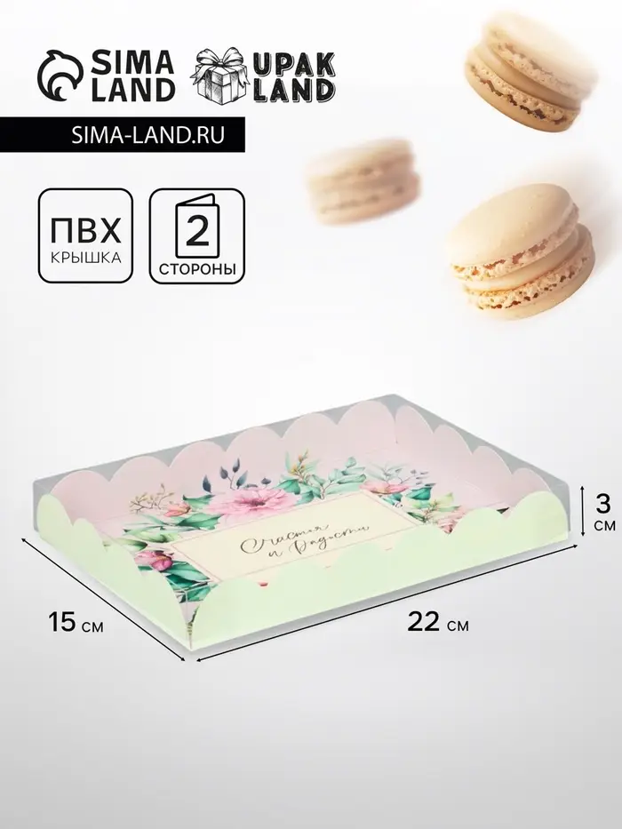 Прочный картон обеспечивает надежную защиту содержимого, а прозрачная крышка позволяет сразу оценить внешний вид угощений без необходимости открывать коробку.