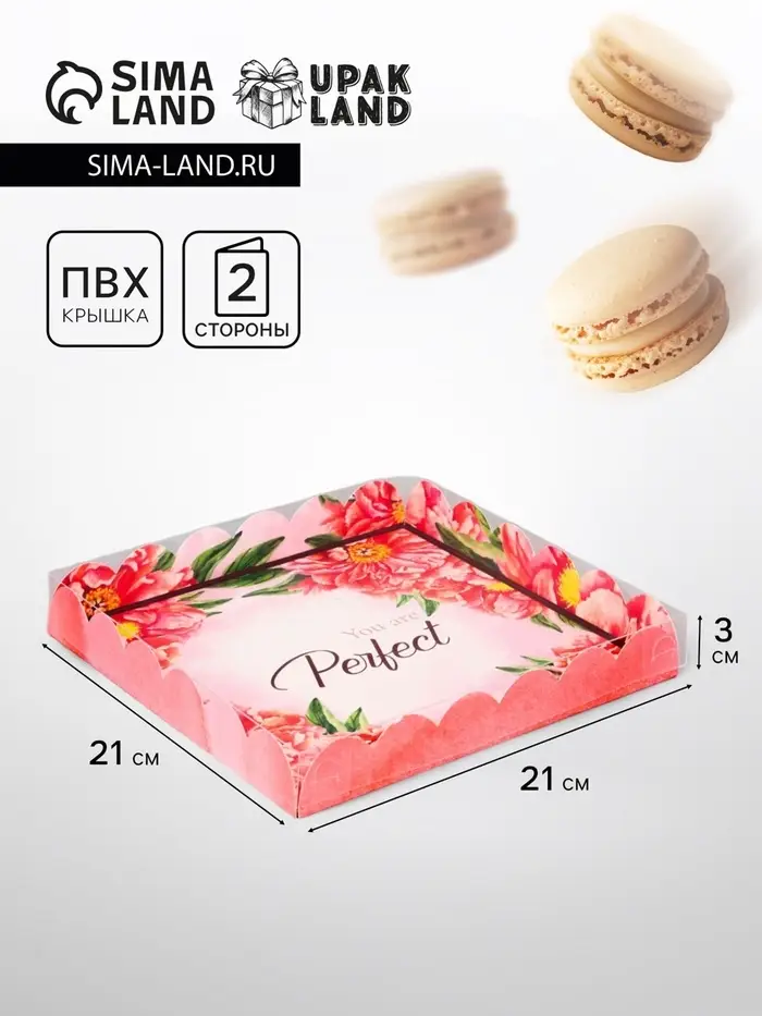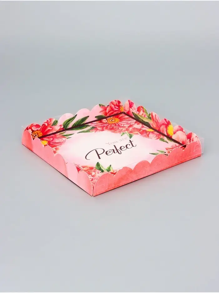 Прочный картон обеспечивает надежную защиту содержимого, а прозрачная крышка позволяет сразу оценить внешний вид угощений без необходимости открывать коробку.