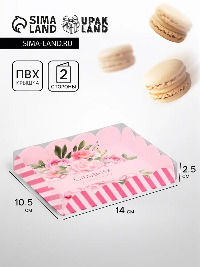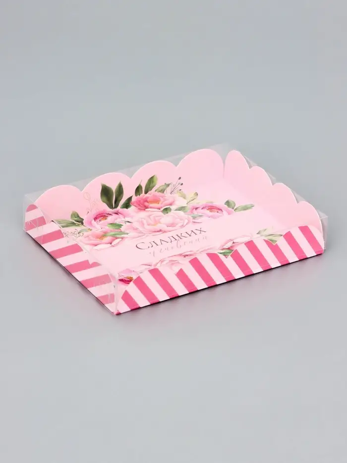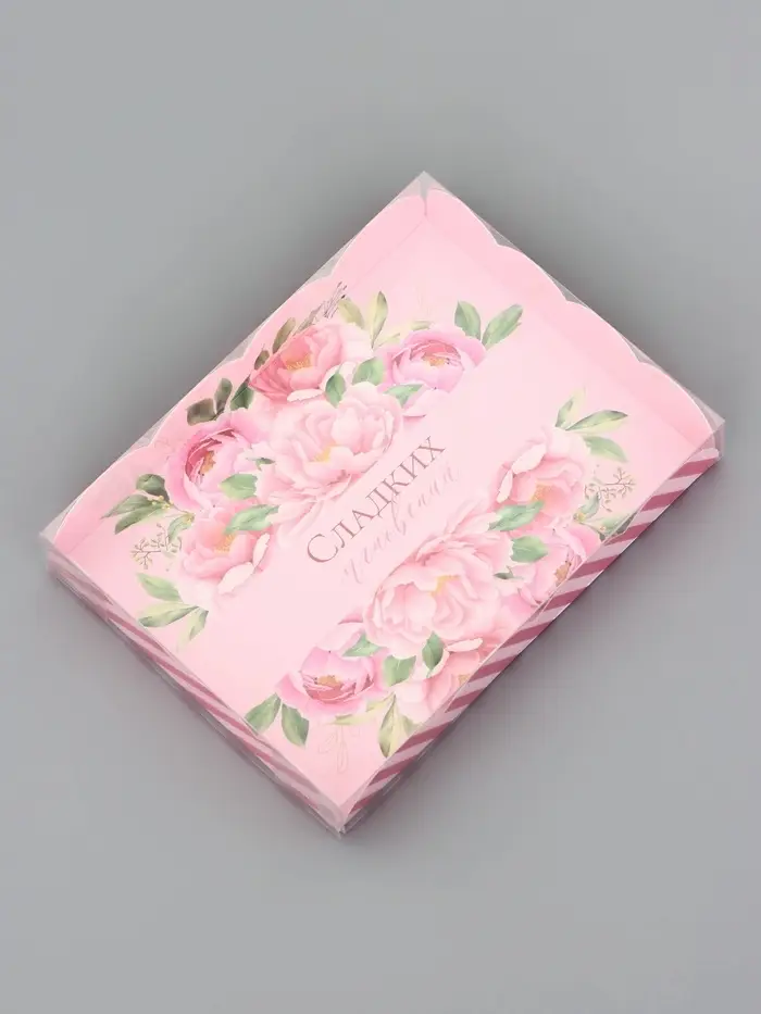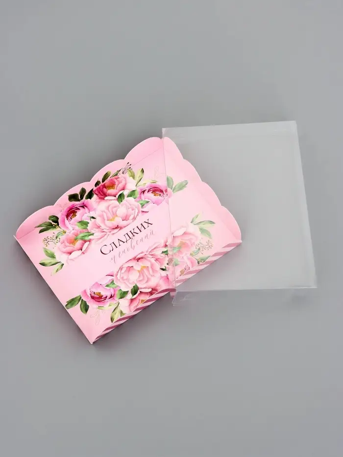 Прочный картон обеспечивает надежную защиту содержимого, а прозрачная крышка позволяет сразу оценить внешний вид угощений без необходимости открывать коробку.