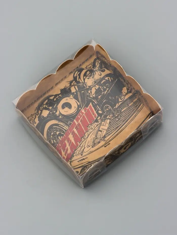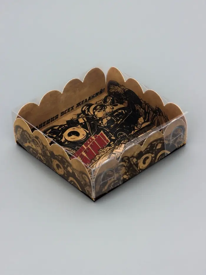 Прочный картон обеспечивает надежную защиту содержимого, а прозрачная крышка позволяет сразу оценить внешний вид угощений без необходимости открывать коробку.