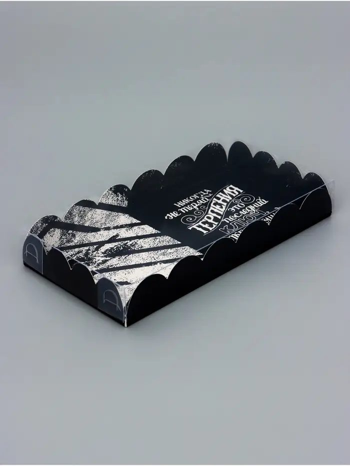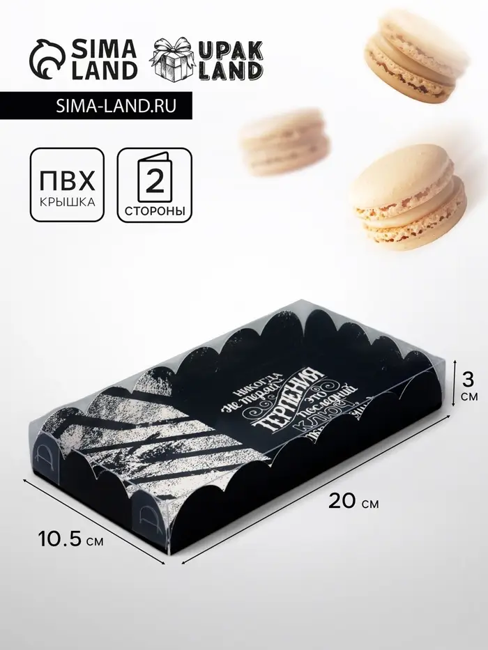 Прочный картон обеспечивает надежную защиту содержимого, а прозрачная крышка позволяет сразу оценить внешний вид угощений без необходимости открывать коробку.