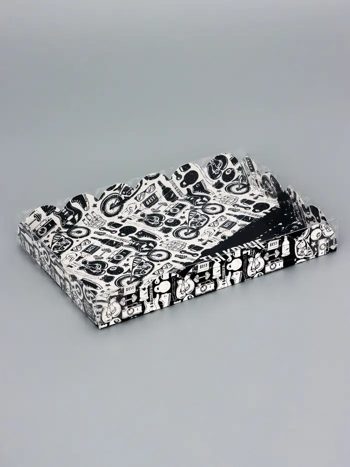 Прочный картон обеспечивает надежную защиту содержимого, а прозрачная крышка позволяет сразу оценить внешний вид угощений без необходимости открывать коробку.