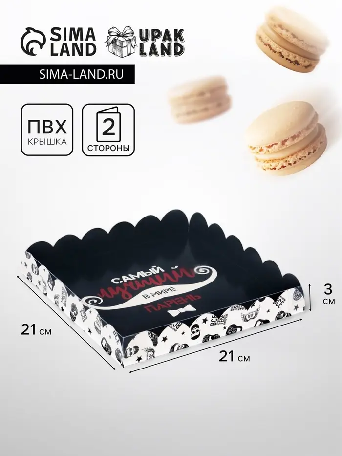 Прочный картон обеспечивает надежную защиту содержимого, а прозрачная крышка позволяет сразу оценить внешний вид угощений без необходимости открывать коробку.