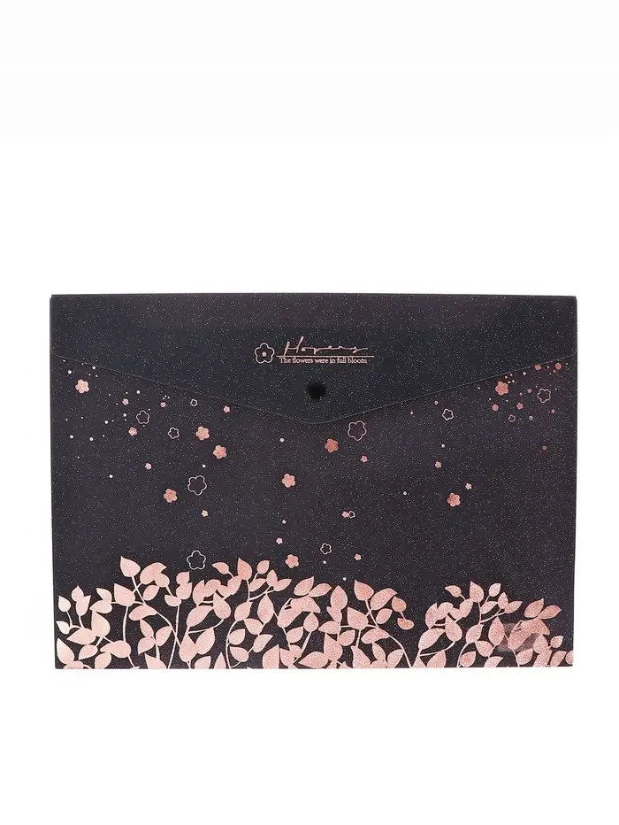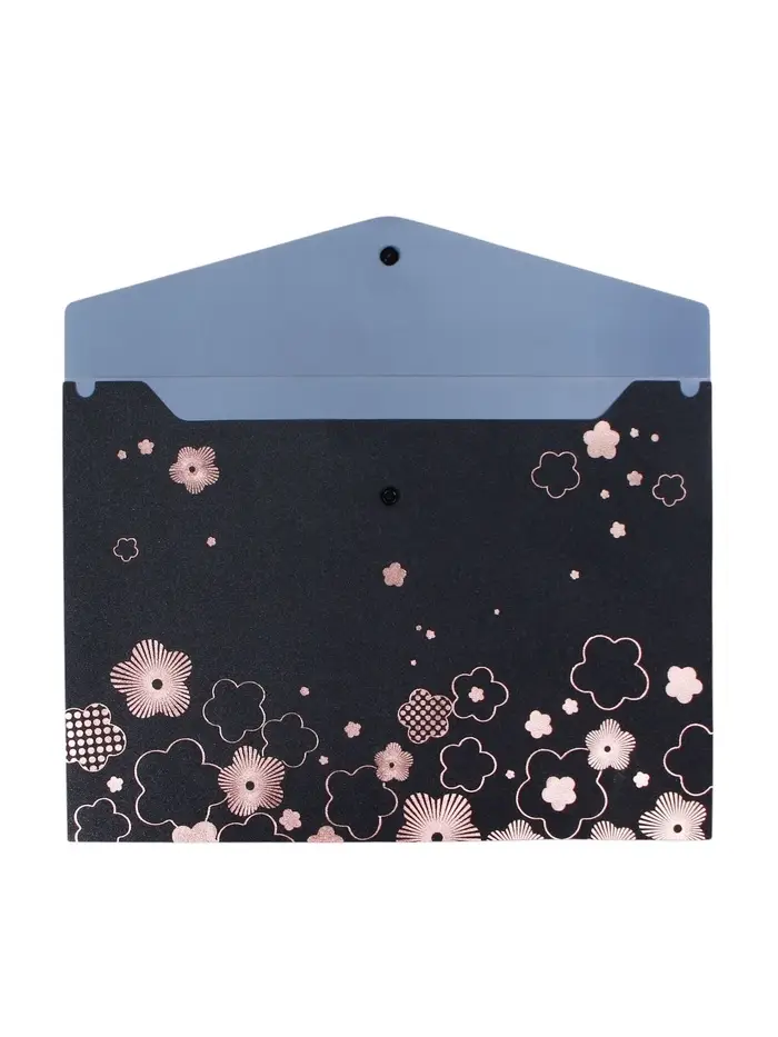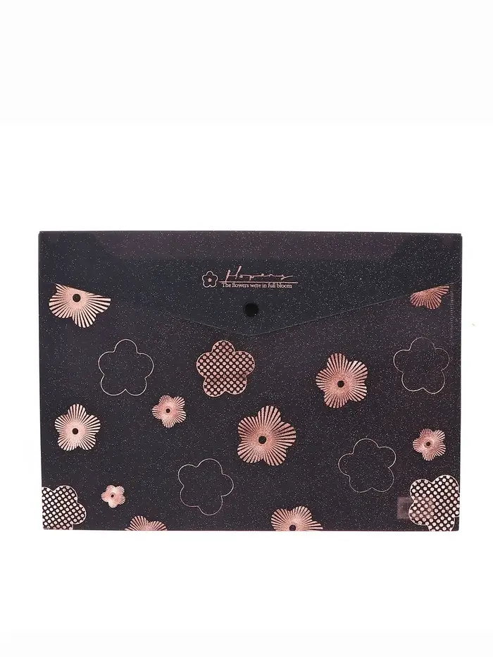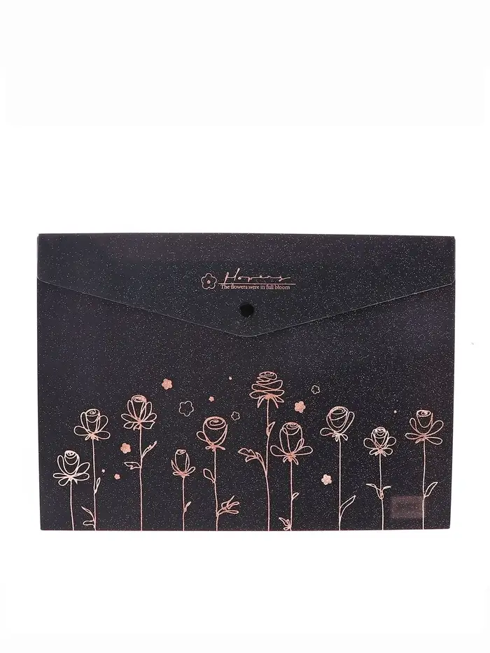 Папка «Конверт на кнопке с цветочным узором» станет вашим надежным помощником в организации документов. Элегантный цветочный дизайн на черном фоне привнесет индивидуальность в вашу рабочую атмосферу, а надежная кнопочная застежка обеспечит безопасность ваших бумаг в формате A4.
