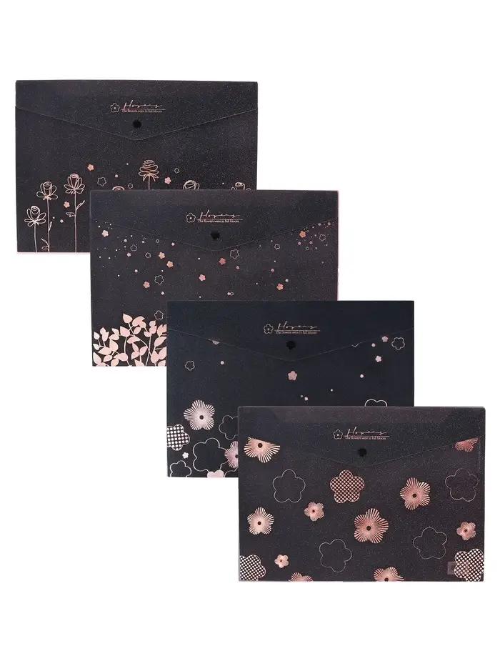 Папка-конверт на кнопке формат А4 180мкр блестящая МИКС Цветы на черном (штрихкод на штуке) 10843