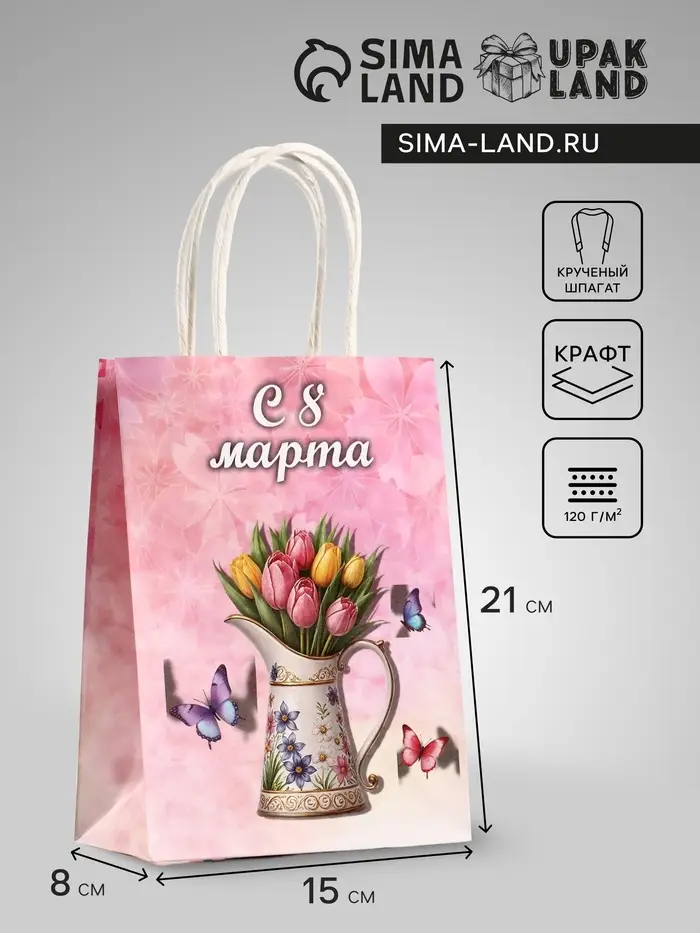 Пакет подарочный крафт, «С Женским Днём» 15×8×21 см