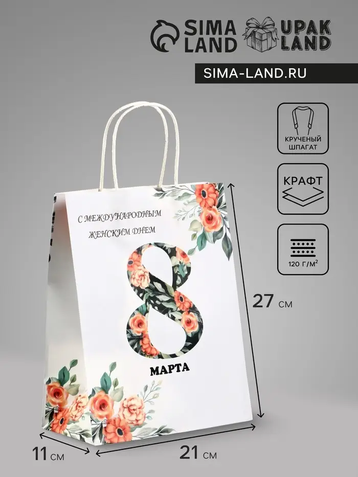 Пакет подарочный крафт, «С Международным Женским Днём», 21×11×27 см