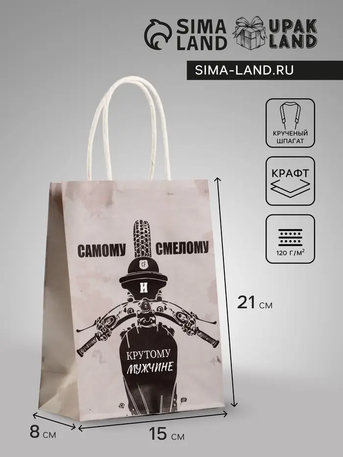 Крафт-пакет с надписью «Самому смелому» — это стильный и универсальный способ упаковать подарок для мужчины. Его лаконичный дизайн в бежевых тонах с акцентом на надписи делает его идеальным выбором для 23 Февраля, дня рождения или других мужских праздников.