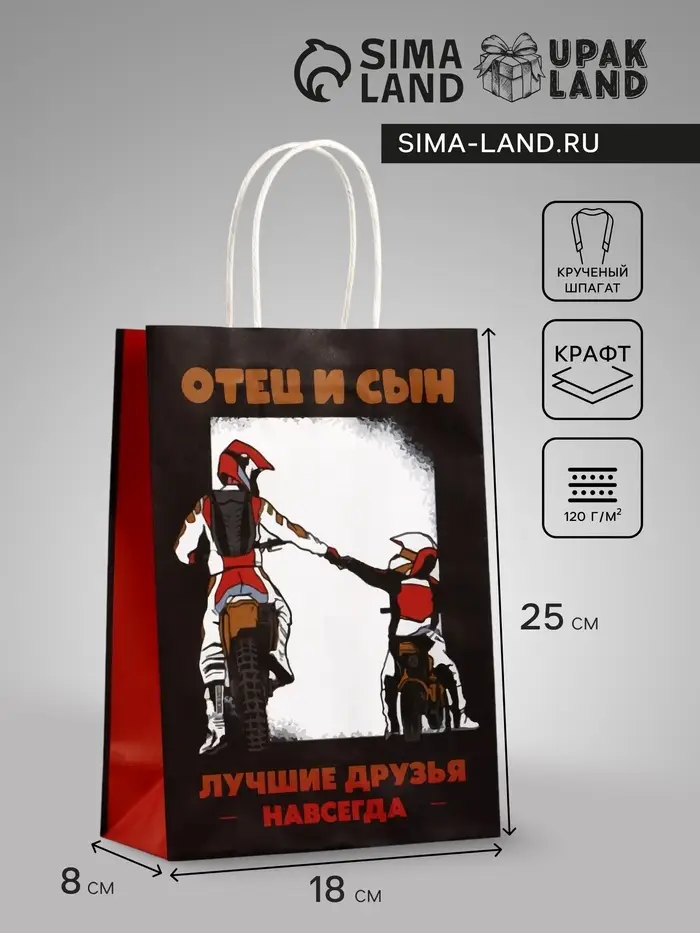 Крафт-пакет «Отец и сын» сочетает в себе эмоциональность и функциональность. Его универсальный дизайн подходит для подарков на День отца, 23 Февраля или другие праздники. Благодаря прочному материалу и оригинальному оформлению, он станет запоминающимся дополнением к вашему подарку.