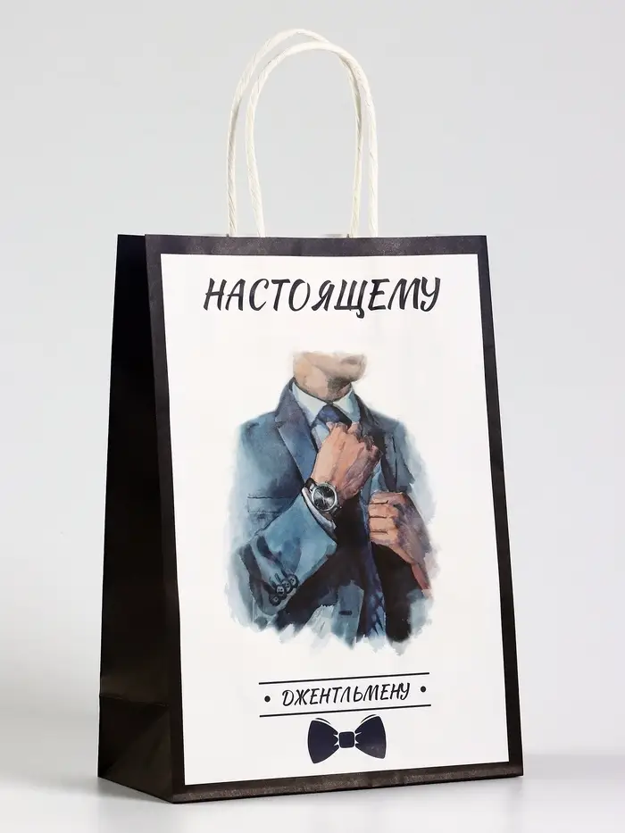 Крафт-пакет «Настоящему джентльмену» сочетает в себе стиль и практичность. Его нейтральный дизайн подходит для подарков на 23 Февраля, день рождения или другие праздники. Благодаря прочному материалу и аккуратному оформлению, он станет достойным обрамлением для любого сюрприза.