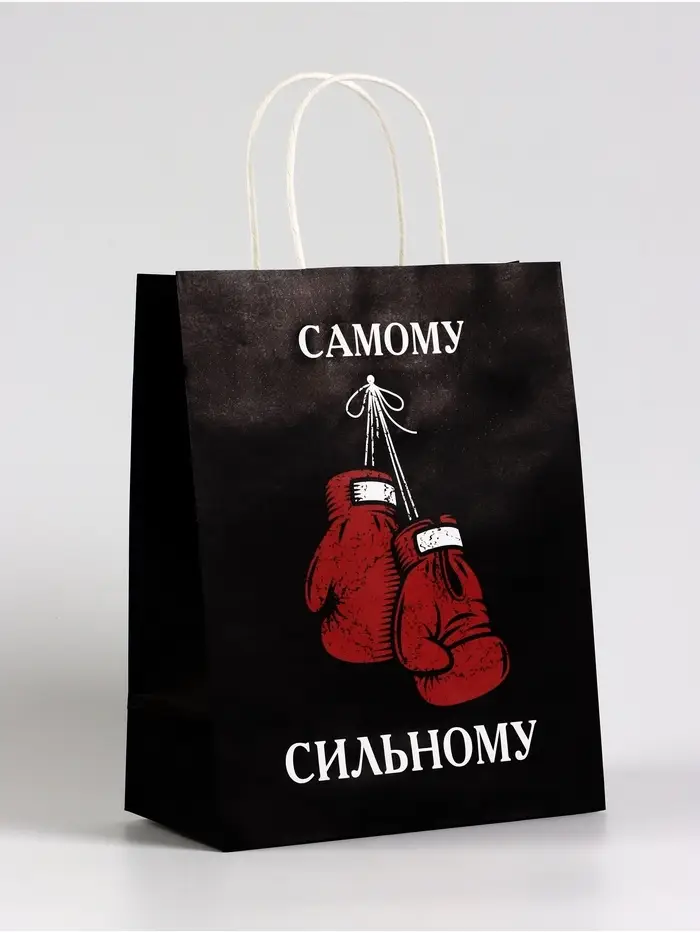 Крафт-пакет с надписью «Самому сильному» — это стильное и практичное решение для упаковки подарков мужчинам. Его лаконичный дизайн в чёрных тонах с акцентом на спортивную тематику делает его идеальным выбором для 23 Февраля, дня рождения или других мужских праздников.