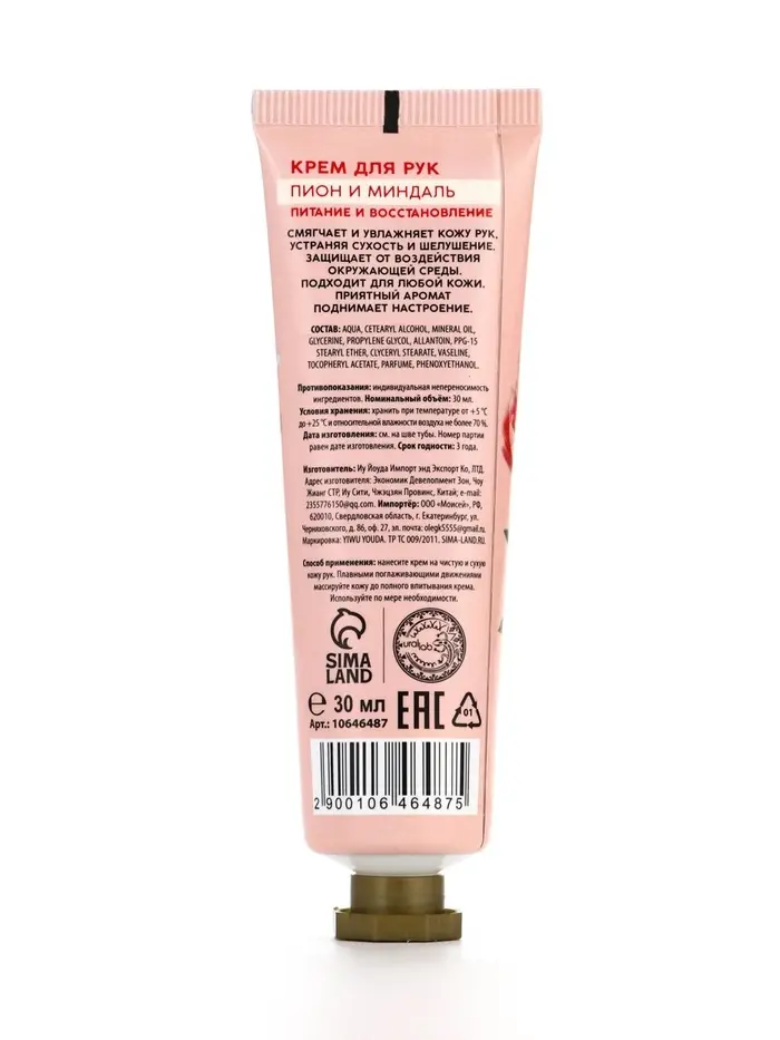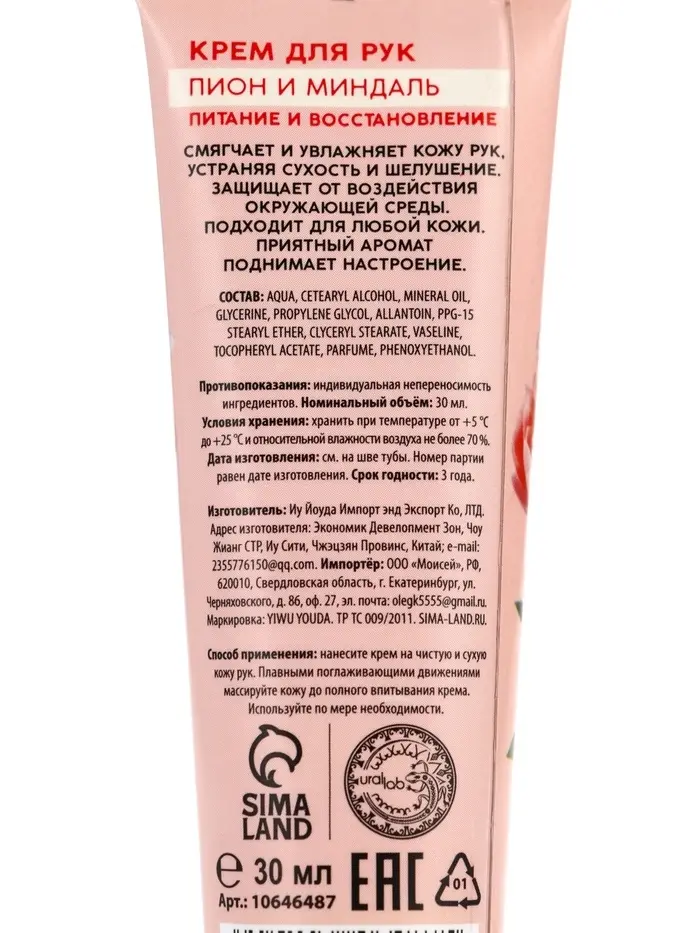 Крем для рук, питание и восстановление, аромат пиона, 30 мл, URAL LAB