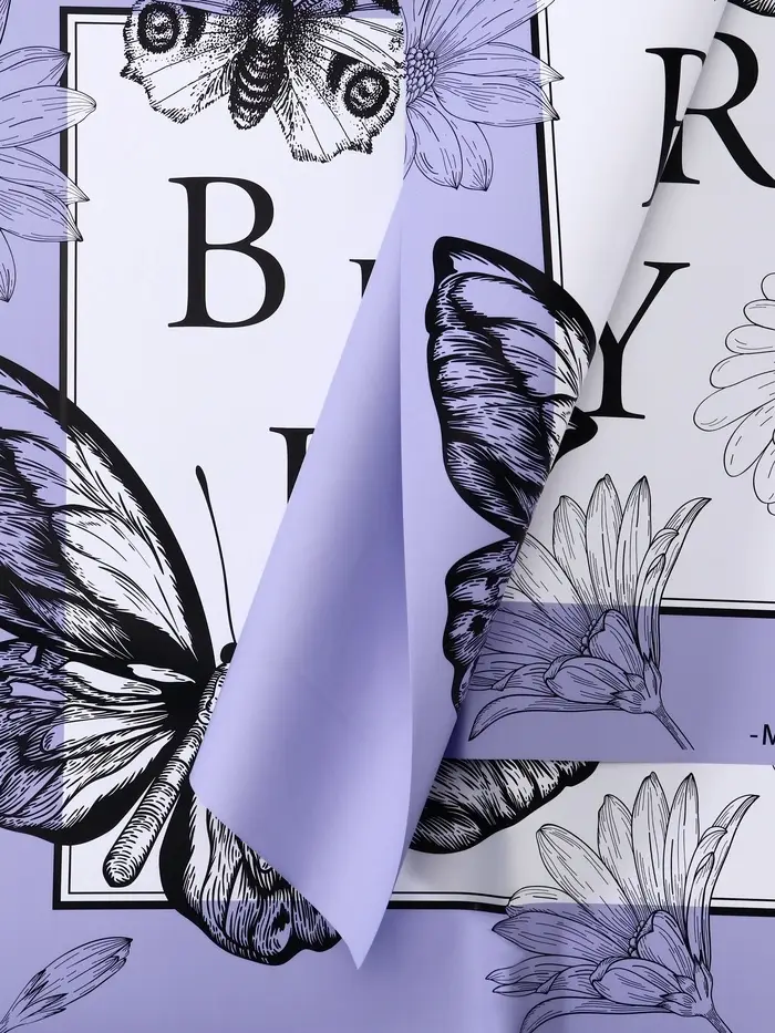 Декоративная плёнка с рисунком бабочек в лиловом цвете — это элегантное решение для упаковки подарков и создания праздничной атмосферы. Её нежный дизайн и универсальность делают её идеальной для оформления букетов и подарков к любому торжеству.