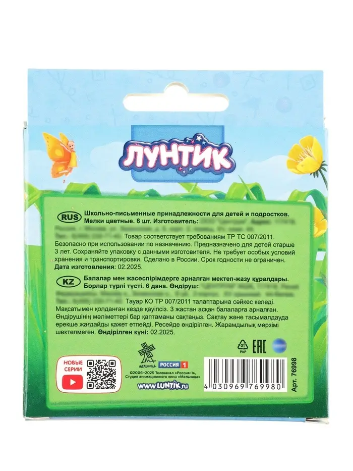 Мел цветной "Лунтик" 6 шт, 1,2х1,2 см с европодвесом 76998