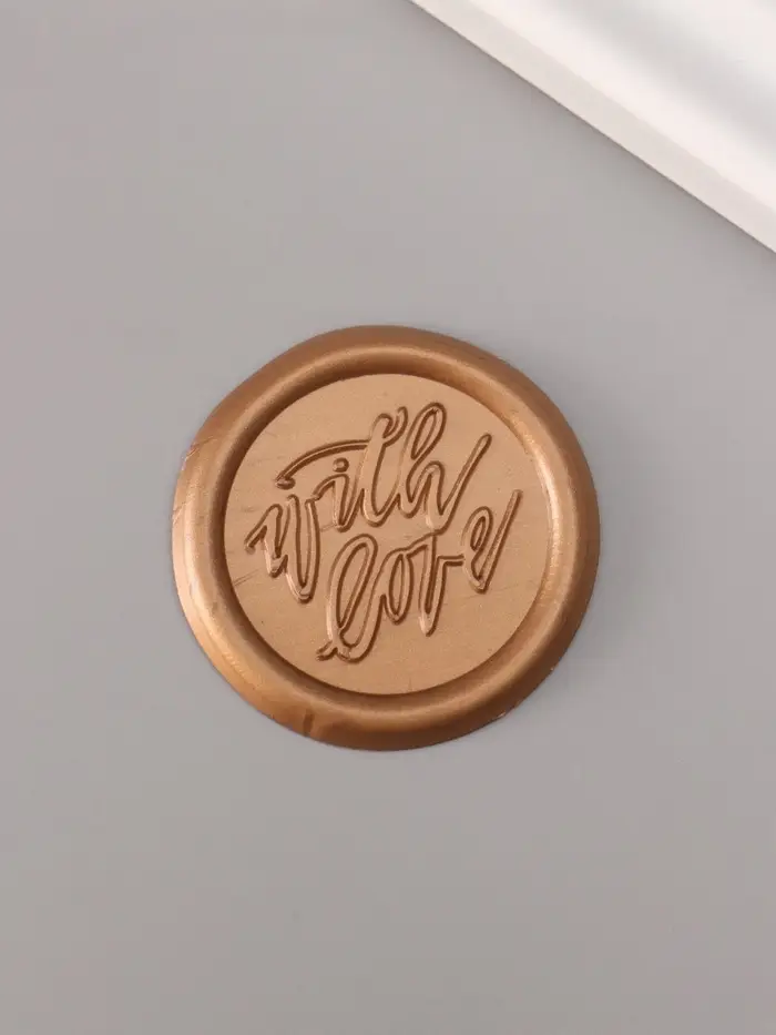Добавьте особую теплоту и элегантность вашим приглашениям, конвертам или сертификатам с помощью декоративного элемента в виде сургучного оттиска. Изделие с надписью «С любовью», выполненной в благородном бронзовом цвете, станет идеальным выбором для тех, кто стремится подчеркнуть внимание к деталям и создать неповторимую атмосферу праздника или важного события.