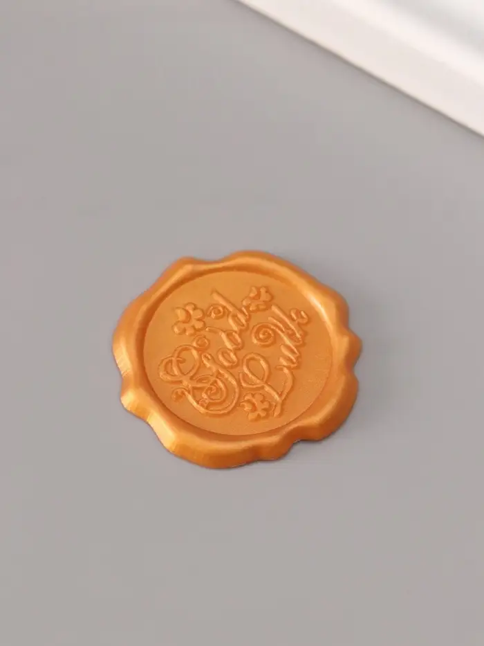 Оттиск выполнен в золотистом цвете и имеет диаметр 3,2 см, что делает его универсальным для различных целей. Он идеально подойдет для украшения свадебных приглашений, подарочных конвертов или сертификатов, добавляя нотку элегантности и стиля.