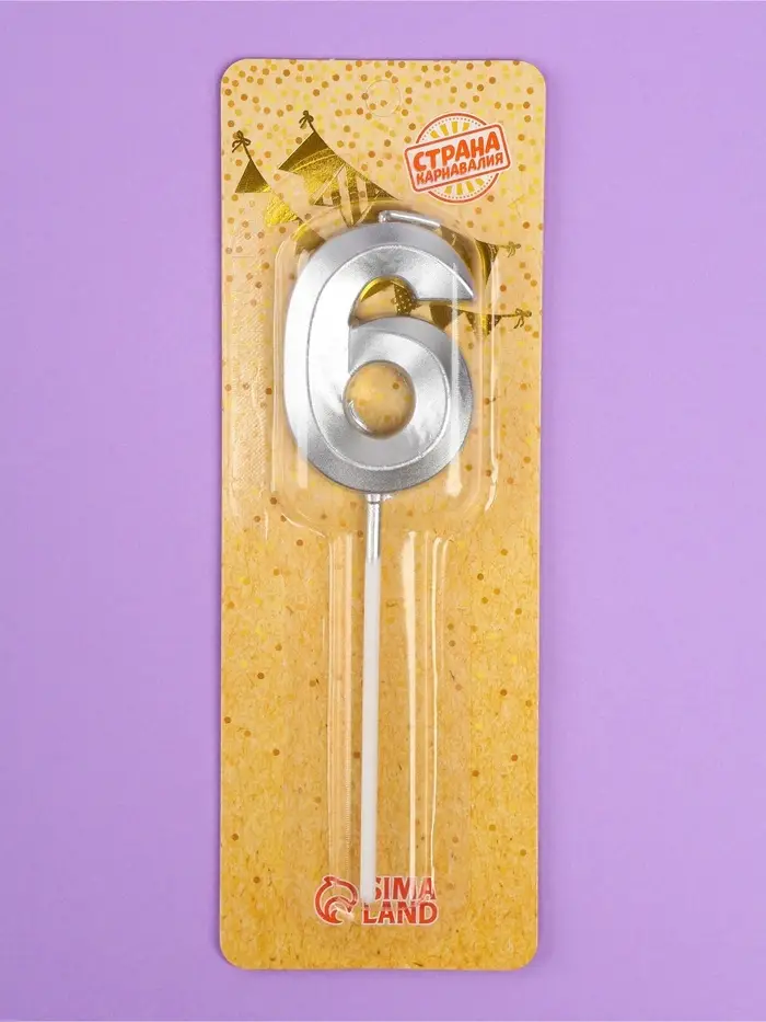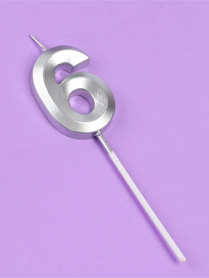 Свеча в торт на шпажке «Грань», цифра 6, серебро, 5 см