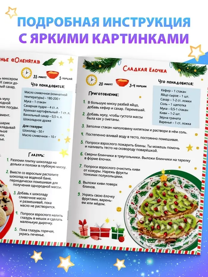 Книга «Новогодние рецепты» — это маленький гид для всей семьи, который поможет создать праздничное меню с лёгкостью и удовольствием. 16 страниц с 13 простыми и вкусными рецептами, подробными инструкциями и яркими картинками делают процесс готовки увлекательным даже для детей от 3 лет. Мягкий переплёт и формат делают её удобной для использования на кухне или в детском саду.