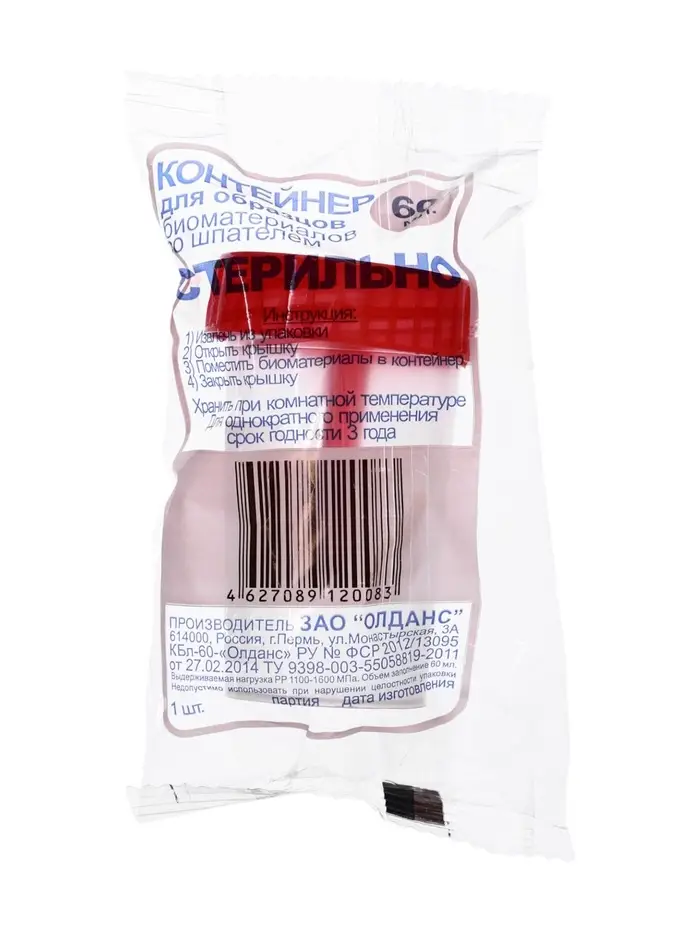 Контейнер со шпателем, стерильный, в индивидуальной упаковке, 60 мл