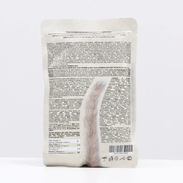 Влажные корма для кошек используются в разных смешанных рационах. Их можно давать в дополнение к натуральной пище или сухим гранулам. Норма кормления указана на упаковке.