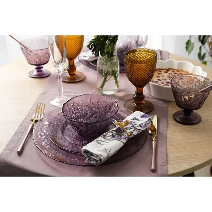 Предметы серии «Французская лаванда» изготовлены из качественного прочного стекла и имеют красивый рельеф в виде лавандовых веточек. Посуда имеет приятный фиолетовый оттенок и будет хорошо смотреться как в праздничной, так и в повседневной сервировке.