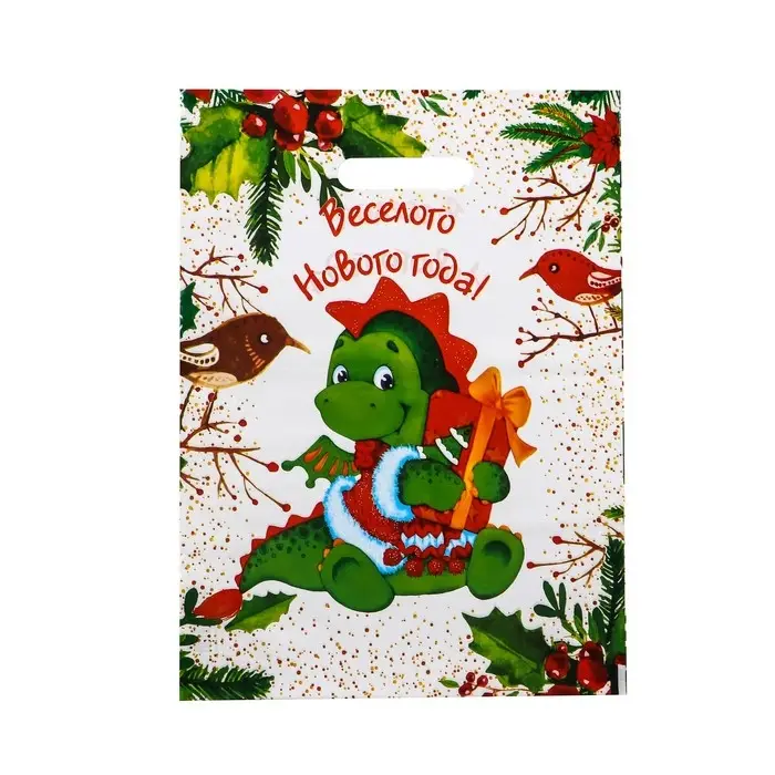 Новогодний подарочный пакет с ярким, красочным рисунком создаст праздничное настроение.