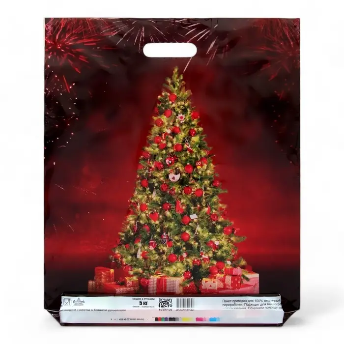 Однако, самое главное в этом пакете – это его уникальный дизайн. Выполненный в традиционных новогодних цветах, он украшен яркими рисунками снежинок, елочных игрушек и других символов Нового года.