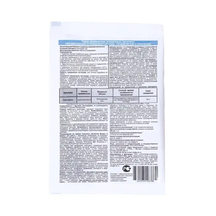 Клотианидин – обладает системным, кишечным и менее выраженным контактным действием. В нервной системе насекомого блокирует постсинаптические холинэргические рецепторы, чувствительные к никотину и расположенные у насекомых в центральной нервной системе. В результате у насекомых наблюдается непроизвольный тремор всего тела с последующей прострацией, параличом и в итоге гибель. Уникальное действующее вещество препарата, имеет широкий спектр активности и позволяет контролировать множество видов насекомых-вредителей.Обладает мощной острой активностью, позволяет быстро справиться даже с большой численностью насекомых-вредителей за короткое время.Системное действие препарата позволяет защитить культуру от скрытноживущих вредителей, борьба с которыми вызывает серьезные трудности.Удобная в использовании препаративная форма и низкие нормы расхода препарата.Гораздо более безопасен для человека, чем инсектициды других химических классов (фосорганика, пиретроиды, карбаматы и др).