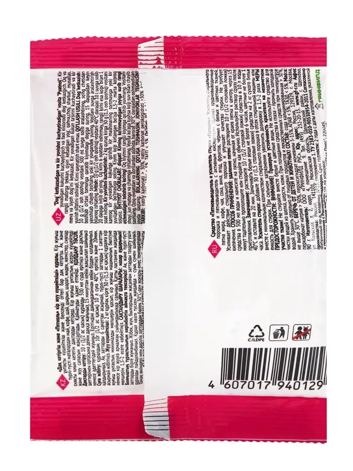 Усиливает действие стирального порошка и улучшает качество стирки. Не требует кипячения. Не содержит хлора.