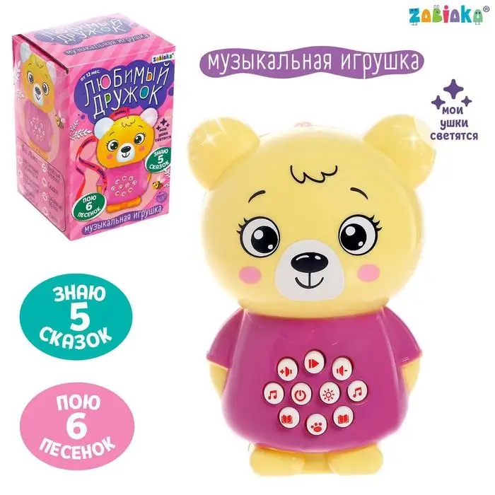 Забавный зверёк воспроизводит 5 сказок, 6 песенок и весёлые фразы.