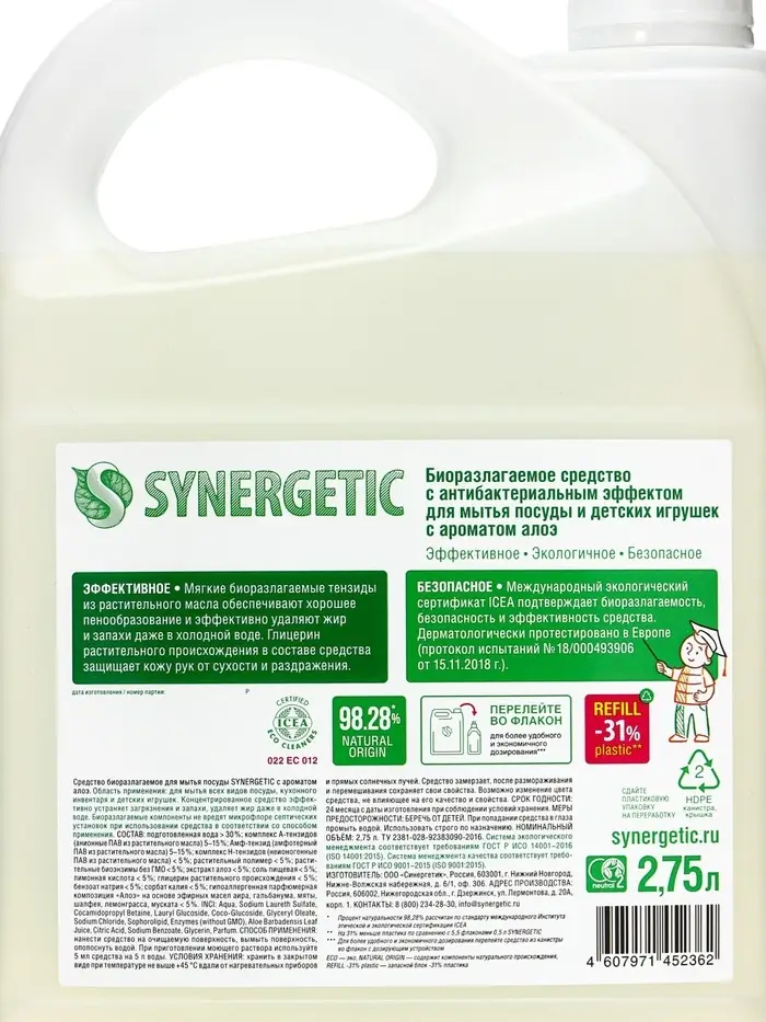 Гель для мытья посуды Synergetic «Алоэ», 2.75 л