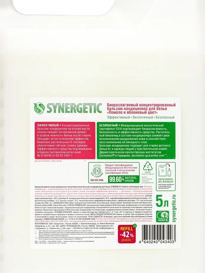 Кондиционер-бальзам для белья Synergetic «Помело и яблоневый цвет», 5 л