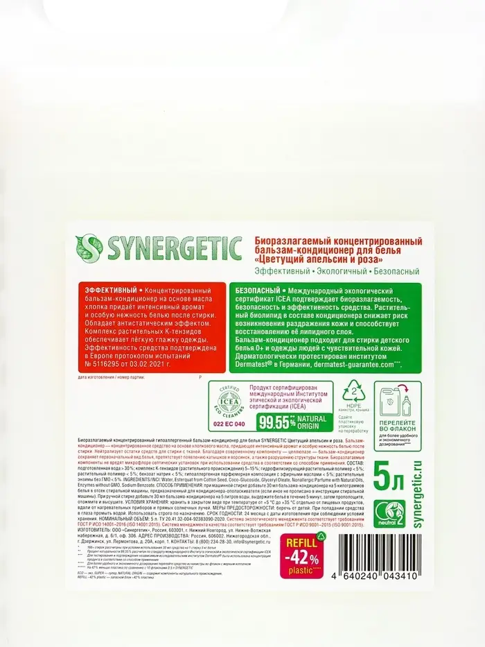 Кондиционер-бальзам для белья Synergetic «Цветущий апельсин и роза», 5 л