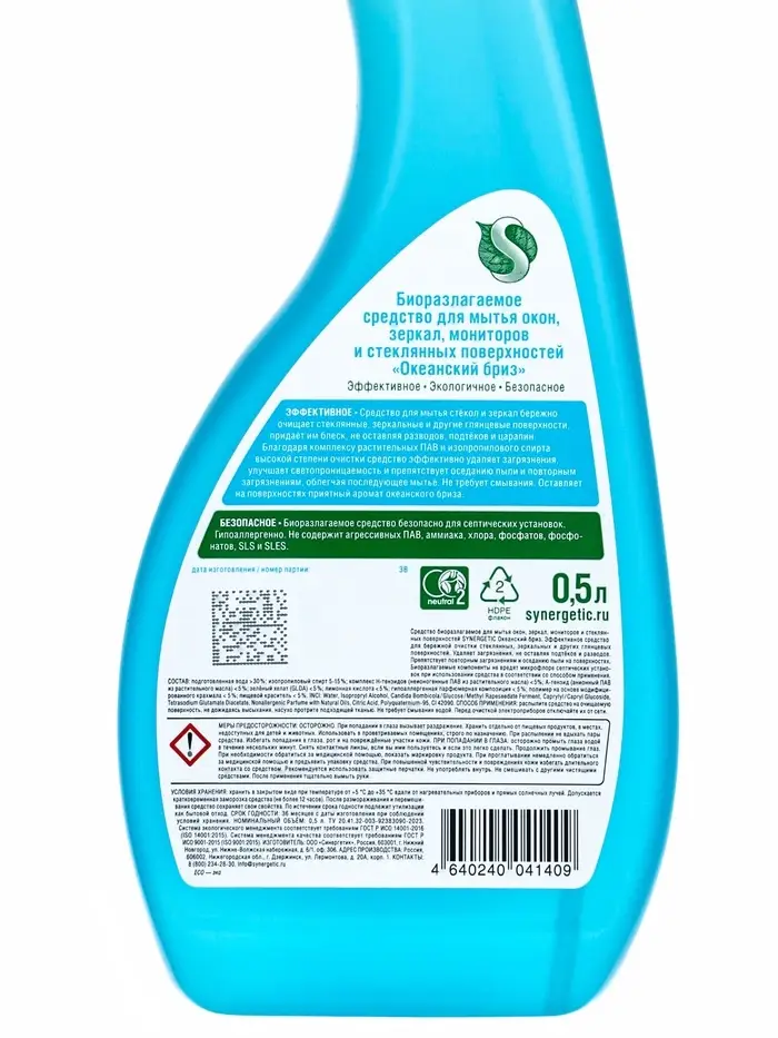 Средство для мытья окон и зеркал Synergetic «Океанский бриз», 500 мл