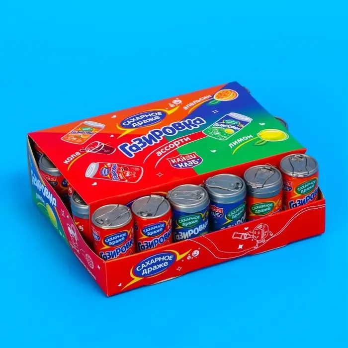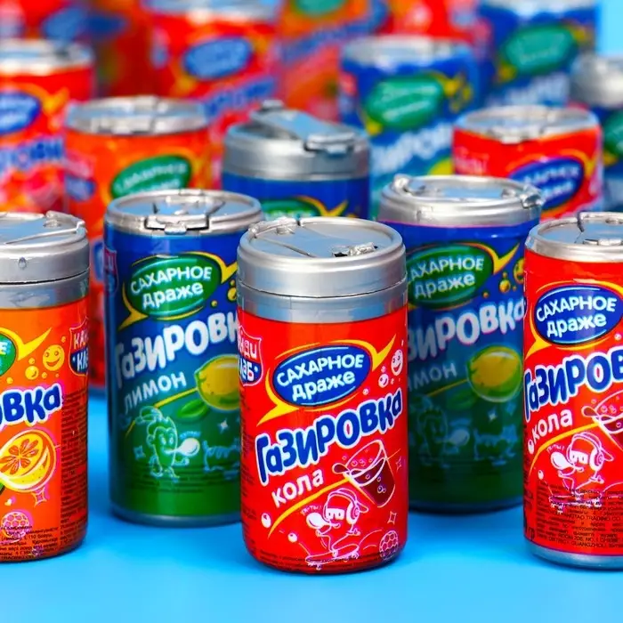 Сахарное драже «Газировка» радует не только сладким вкусом, но и необычным дизайном. Конфеты находятся в пластиковых упаковках в виде банок газировки. Вкусное драже подходит как для украшения праздничного стола, так и для дополнения подарка на день рождения, Новый год и другие праздники.