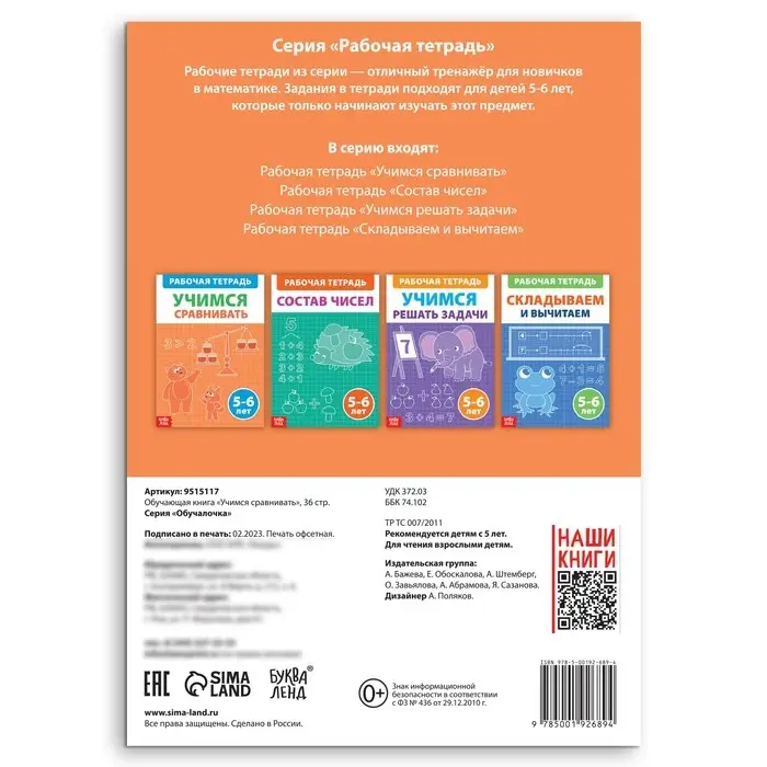 Книги из серии «Рабочие тетради» — это эффективные тренажёры для новичков в математике. Задания в тетрадях подходят для детей 5–6 лет, которые только начинают изучать этот предмет.